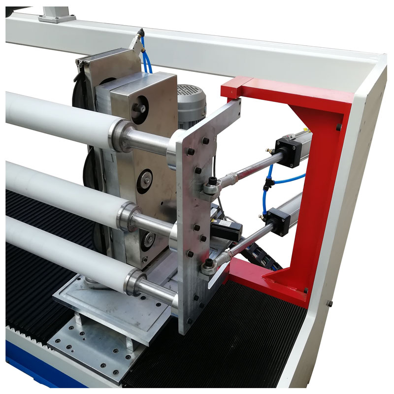 4. 圓刀自動角度調(diào)整,使用伺服馬達(dá)計算圓刀角度轉(zhuǎn)向,因應(yīng)不同材料做不同角度變化